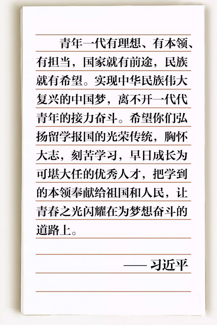 “把学到的本领奉献给祖国和人民,让青春之光闪耀在为梦想奋斗的道路上。”习近平主席对青年学子的热忱勉励,不仅为海外学子们指明了人生航向,也影响和改变了许多人的事业选择和价值取向。