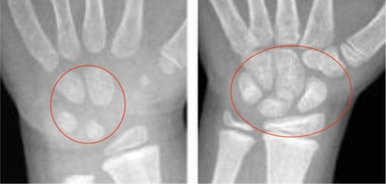 二是依据腕骨的多少、密度来判断。腕骨越少,生长空间越大,骨龄越小。