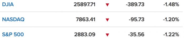 美东时间8月12日周一,受国际贸易前景不明朗、地缘政治局势紧张影响,10年期美债收益率大幅下跌,投资者恐慌情绪蔓延,美股三大股指收跌,其中道指跌近400点。截止至北京时间8月13日04:00收盘,道琼斯工业平均指数跌1.48%,报25897.71点;纳斯达克综合指数跌1.20%,报7863.41点;标普500指数跌1.22%,报2883.09点。