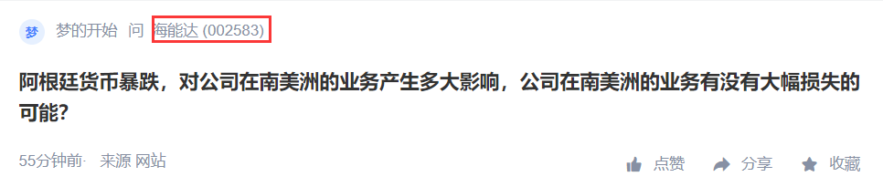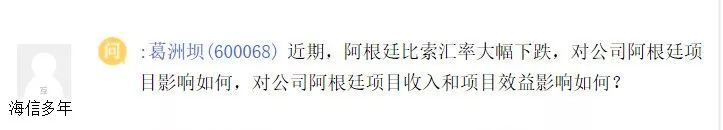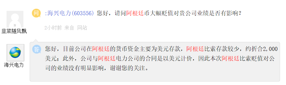 比如,有投资者提问海兴电力:“请问阿根廷币大幅贬值对贵公司业绩是否有影响?”