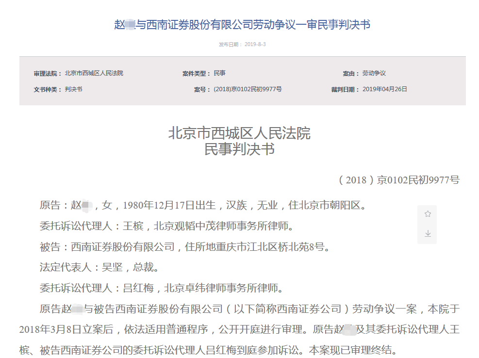 此次诉讼的原告赵某系2015年6月入职西南证券,并被聘任为机构客户部北京机构销售负责人。就职责内容来看,主要负责为北京地区公募客户及部分保险、私募客户提供证券综合服务及开立席位等,以客户在交易席位上的交易佣金作为绩效奖金收入,同时,负责北京地区机构销售团队的招聘、管理、与西南证券其他分支机构业务协调合作等。