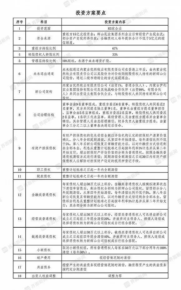 8月12日,界面新闻获得的上述投资要点便是最新的重组方案内容,在辉山乳业大厦,一名管理人成员也向界面新闻确认了伊利该项投资方案,并强调“目前基本确定了是伊利,只是部分债权人不认同还款细则,方案可能还需要伊利和债券委员会磋商”。