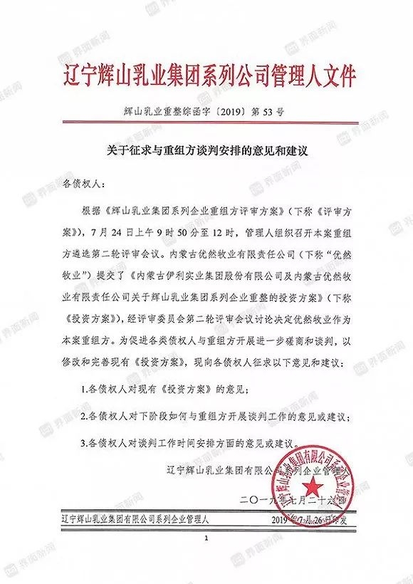 界面新闻独家获得的文件显示,一份由“辽宁辉山乳业集团系列公司管理人”在7月26日下发的文件称,根据《辉山乳业集团系列企业重组方评审方案》,7月24日管理人组织召开本案重组方遴选第二轮评审会议,内蒙古优然牧业有限公司(伊利控股的子公司)提交了《内蒙古伊利实业集团股份有限公司及内蒙古优然牧业有限责任公司关于辉山乳业集团系列企业重整的投资方案》(下称“投资方案”)。经评审委员会第二轮评审会议讨论决定优然牧业作为本案重组方,并开始向债权人征求意见,以修改和完善《投资方案》。