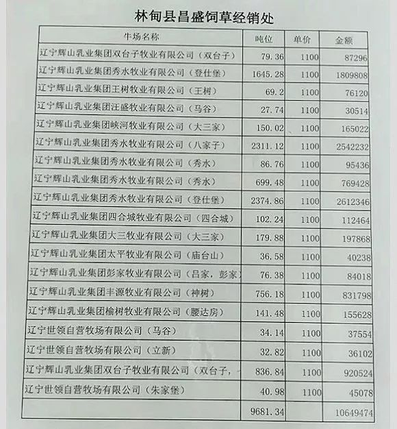 他向界面新闻提供的供应单据显示,亓志民的公司在合同期内先后向辉山乳业14个牧场提供草料9681.34吨,欠款金额1064.9万元。