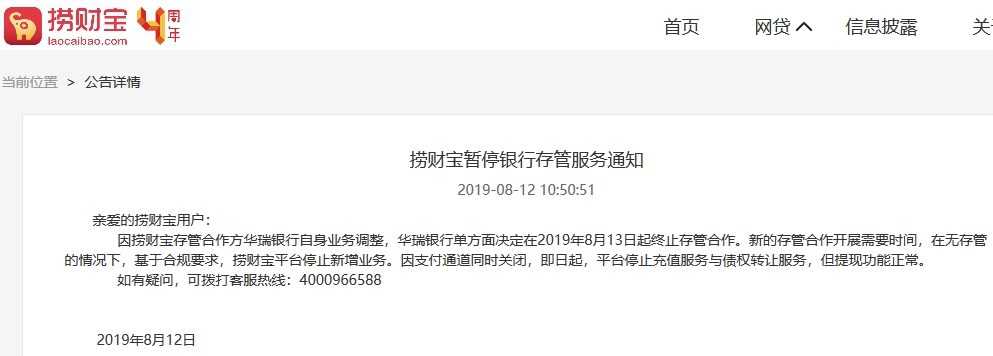 而此前,8月12日,证大财富运营主体上海证大投资咨询有限公司(下称“证大投资咨询”)旗下P2P平台捞财宝公告称,“因捞财宝存管合作方华瑞银行自身业务调整,华瑞银行单方面决定在2019年8月13日起终止存管合作。公告称基于合规要求,平台停止新增业务。因支付通道同时关闭,即日起,平台停止充值服务与债权转让服务,但提现功能正常。”