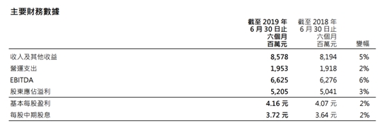 8月14日,港交所发布2019年中报业绩,报告期内,公司实现营业收入85.78亿港元,同比增长5%,归属股东净利润52.05亿元,同比增长3%。