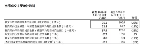 2019年上半年,由于受到国际形式等不稳定因素影响,市场成交主要数据出现多方下滑,香港证券市场平均每日成交金额为979亿港元,较去年同期下滑23%,其中股票日均成交额751亿港元,同比下滑25%,衍生权证、牛熊证及权证平均每日成交额228亿港元,同比去年下跌13%,股票期权合约平均每日成交张数50.8万张,同比下跌11%。