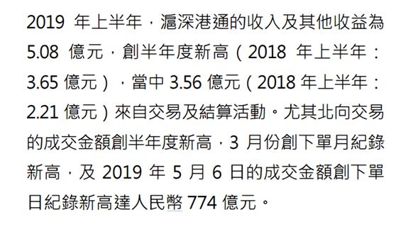 2019年上半年,沪深港通的收入及其他收益为5.08亿港元,创半年度新高(2018年上半年为3.65亿港元),其中3.56亿港元来自交易及结算活动,尤其北向交易的成交额创半年度新高,3月份刷新单月记录新高,及2019年5月6日的成交额刷新单日记录新高达人民币774亿元。