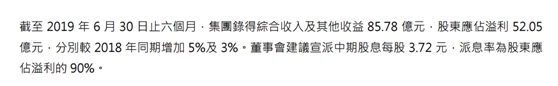 港交所中报显示,公司董事会建议派发中期股息每股3.72港元,派息比例达90%。