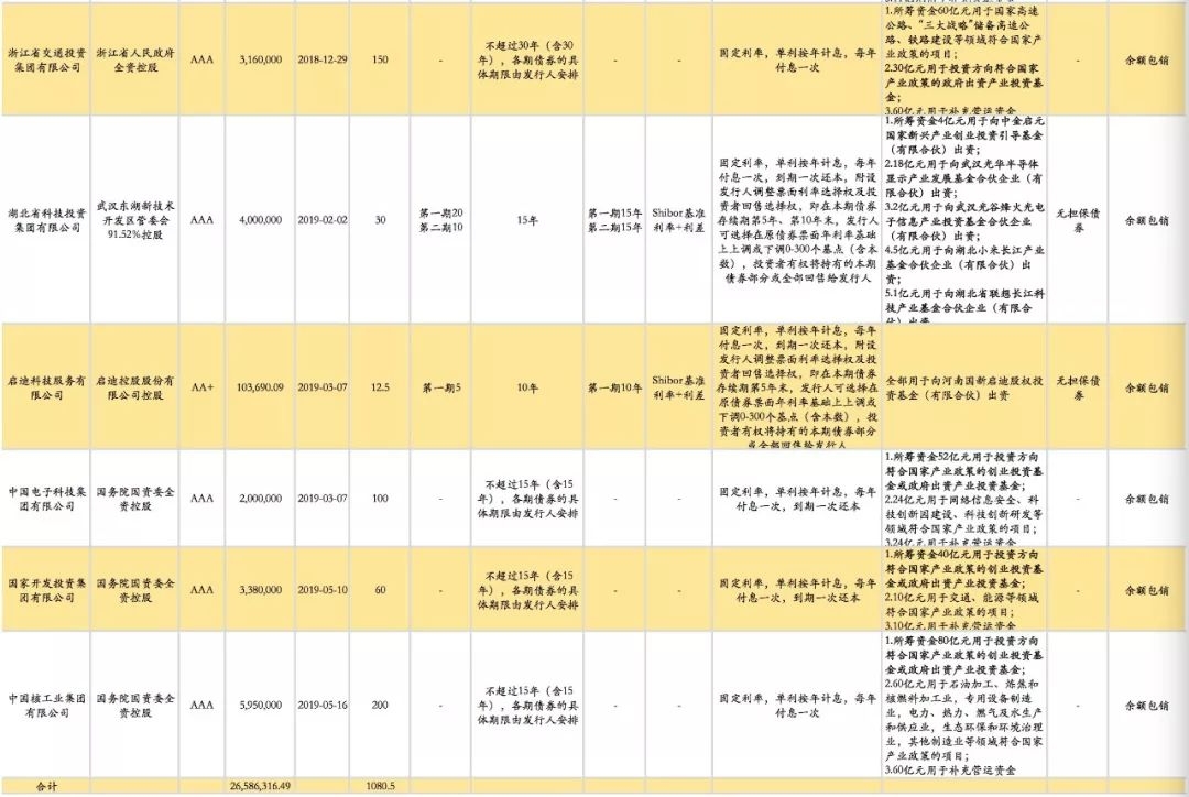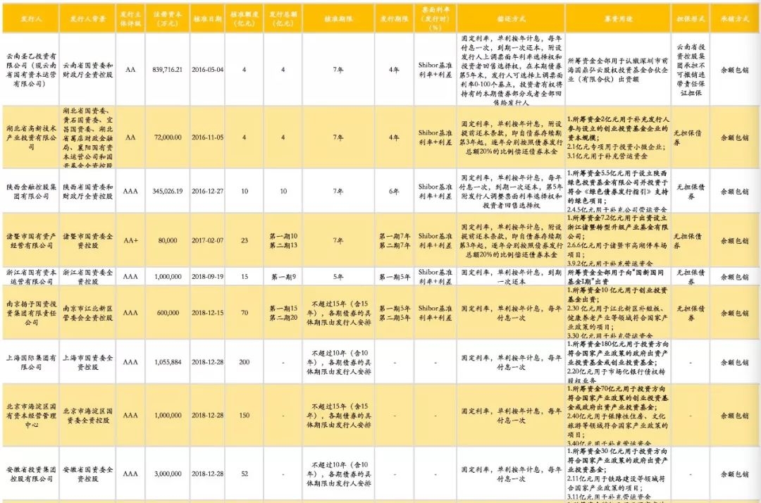 从发行主体看,2016-2017年4支基金债的发行人均是创业投资基金、政府出资产业投资基金的股东或有限合伙人。2018年发行人不再局限于基金的股东或LP,而是拓展至诸如中国核工业集团、浙江省国资运营这一类的国企、央企。