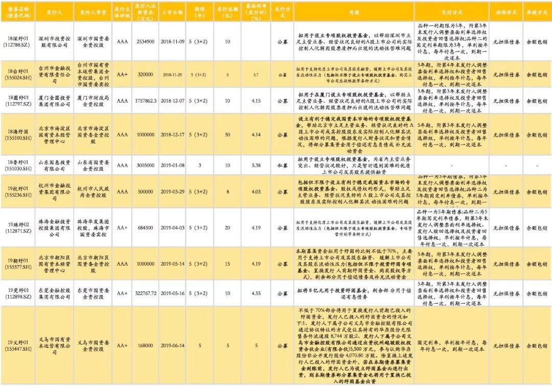 这些发行纾困专项债设立股权投资基金的发行主体,均为地方人民政府、国资委或财政局下属的平台公司、评级在AA+以上。除了“18鲁纾01”私募发行外,其他9支纾困债券均公开发行,均为无担保债券,发行期限不超过5年,发行时票面利率较低,除了“18鲁纾01”均不超过5%,通常附第3年末发行人调整票面利率选择权及投资者回售选择权,单利按年计息,每年付息一次,到期一次还本。承销方式和企业债券形式发行的基金债一样,全部被承销团以余额包销的方式承销。