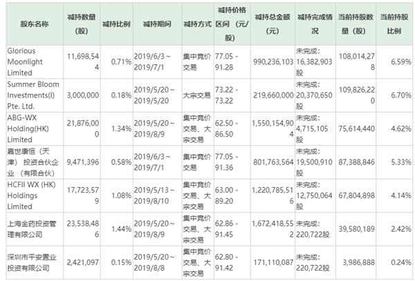 在此之前,4月30日,药明康德披露股东减持计划显示,上述7名股东计划减持不超过11.93%的股份,减持窗口期为5月29日-8月10日。彼时,ABG-WX Holding (HK) Limited、HCFII WX (HK) Holdings Limited两家持股比例也在5%以上,且7家股东中,除平安置业外,其余均系药明康德前十大股东。