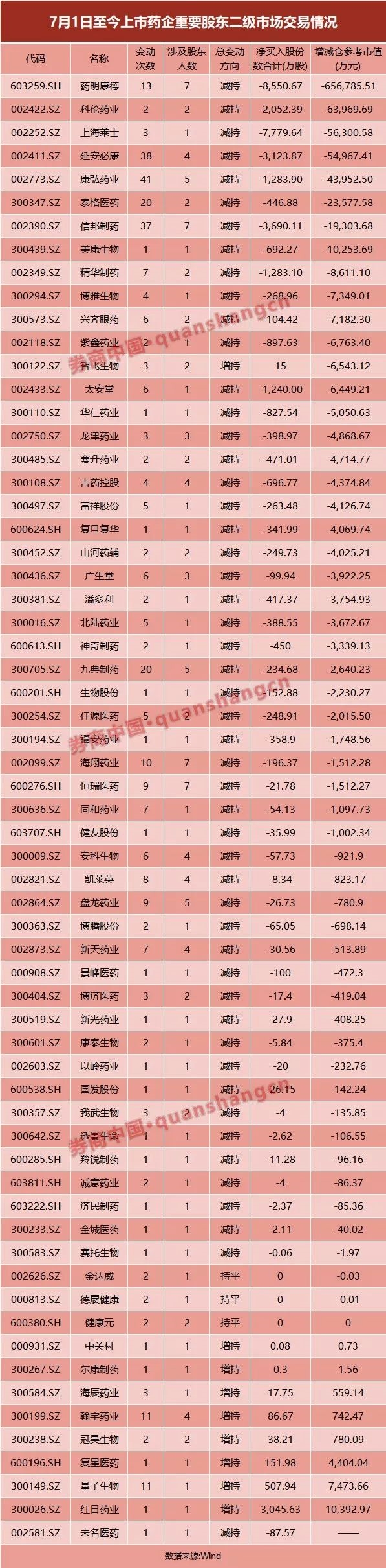 数据显示,下半年以来,共有63家医药股重要股东在二级市场上交易。其中,总变动方向为减持的有51家,增持数量仅有9家,还有3家持平。除药明康德外,科伦药业、上海莱士、延安必康等公司减仓金额也在5亿元以上。
