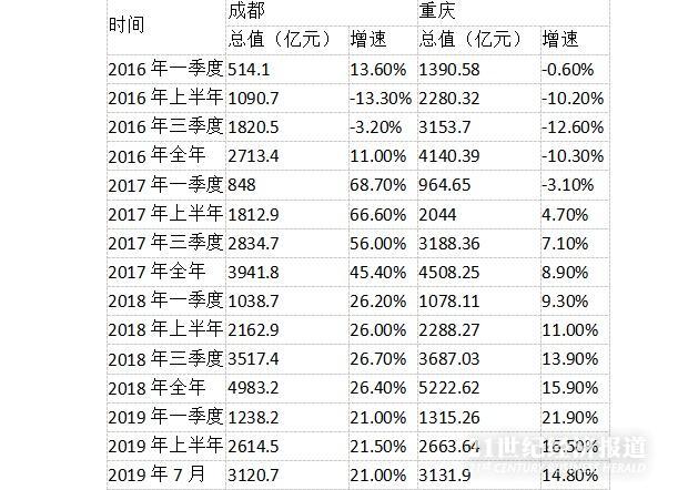 21世纪经济研究院分析师统计的2016-2019年7月期间,成都与重庆的差距逐步缩小。
