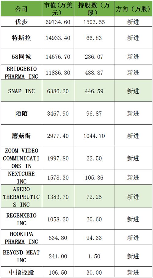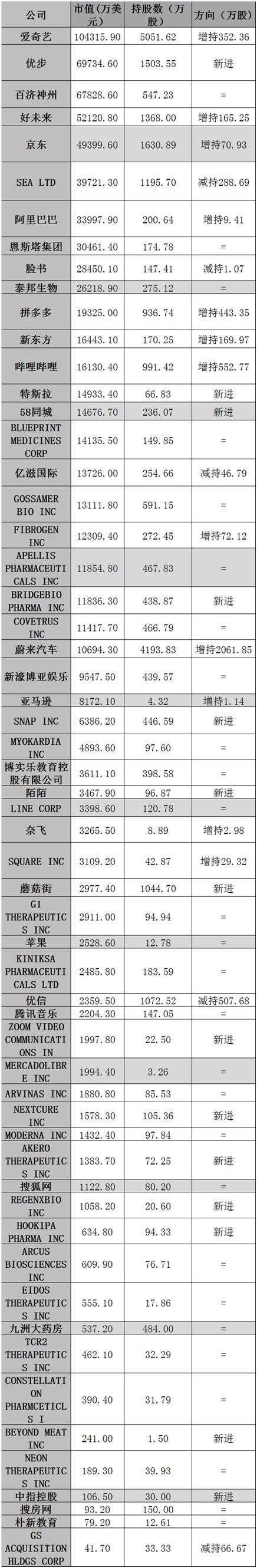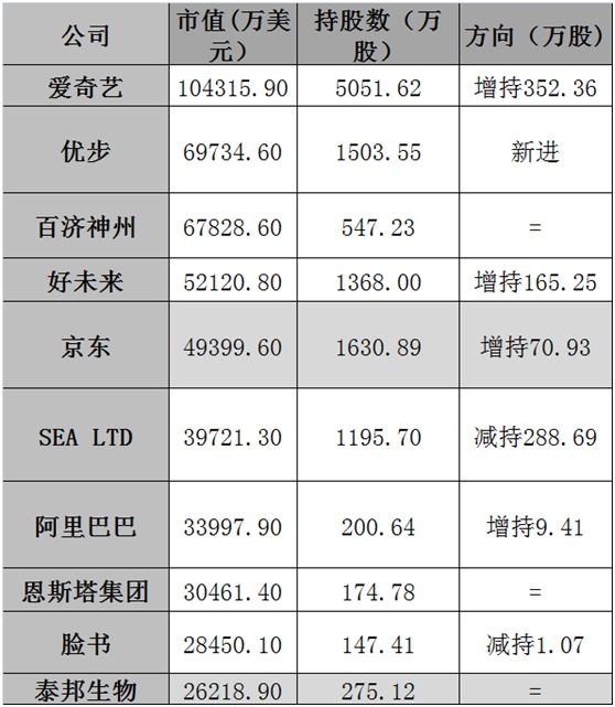 其次为优步、百济神州、好未来、京东等,前十大持仓的合计市值高达50.22亿美元,占整个组合比重达66%。