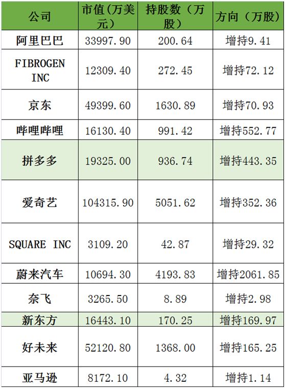 此外,高瓴还增持了阿里巴巴、亚马逊;新东方、好未来;翻倍增持蔚来汽车等。