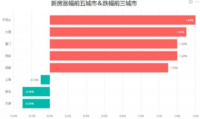 具体来看,热门二线城市的新房市场复苏值得关注。平顶山、大理、厦门、西安和成都领衔新房价格涨幅,而上海、天津和南充则位列跌幅榜前三。