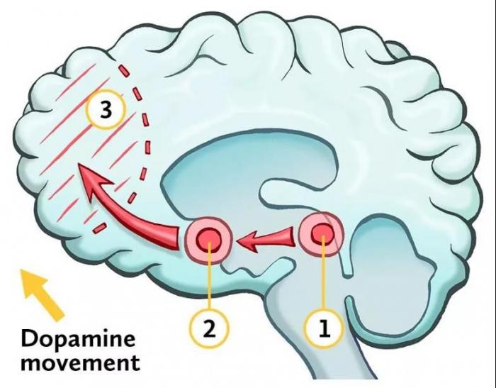 在这个模型中,1 叫做 VTA,2 是伏隔核,它们共同构成了一条通路;3 是前额叶皮层,负责认知、行为、调控功能。