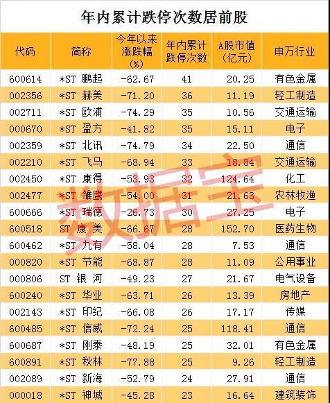 不过从年内累计跌停次数来看的话,*ST鹏起以41个跌停板排名A股之首。与其他ST股票一样,*ST鹏起在被实施“退市风险警示”特别处理后股价便遭遇连续重创,最新股价已不足1.5元。*ST赫美、*ST欧浦、*ST盈方、*ST北讯、*ST飞马等累计跌停次数均在30次以上。