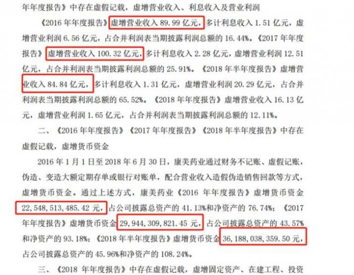 经证监会查明,康美药业《2016年年度报告》虚增货币资金225.8亿元,占公司披露总资产的41.13%和净资产的76.74%,虚增营业收入89.99亿元;《2017年年度报告》虚增货币资金299.4亿元,占公司披露总资产的43.57%和净资产的93.18%,虚增营业收入100.32亿元;《2018年半年度报告》虚增货币资金361.9亿元,占公司披露总资产的45.96%和净资产的108.24%,虚增营业收入16.13亿元。