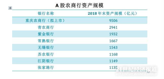 根据21世纪经济报道记者的整理,与已经登陆A股的其他7家农商行相比,重庆农商行2018年末资产规模远远领先,是当前A股排在第一的青农商行的3倍有余。唯有6月刚刚得到银保监局批复同意IPO的上海农商行可以与之抗衡,后者2018年末总资产规模为8337亿元。