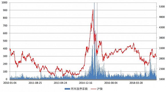 从下图可以看出,在最近的一轮大牛市前后,两市每日收盘涨停个股家数大增,即便之后指数深度回调,两市涨停家数相较于2015年前也有明显的增多,这些都为打板族的盛行奠定了坚实的基础。
