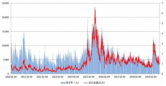 数据显示,近几年,虽然由于新股的大量发行,两市的成交总额相较于最近一轮大牛市爆发之前大幅增加,但是市场总体的换手率却并没有明显的提升,交投相对萎靡,市场活跃度不高。