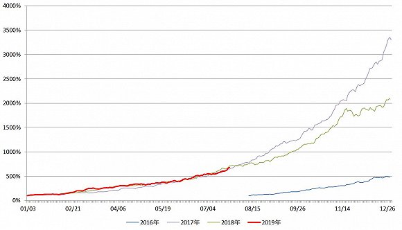 界面新闻统计了2016-2019年前一日涨停板股票次日股价的表现情况,其中表现最好的2017年,对应的指数涨幅高达33倍。今年以来,对应指数的涨幅也已经达到了6.84倍。
