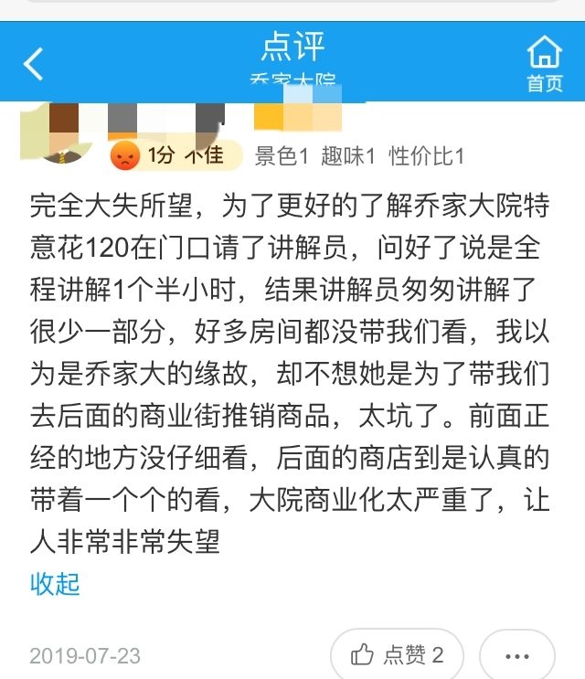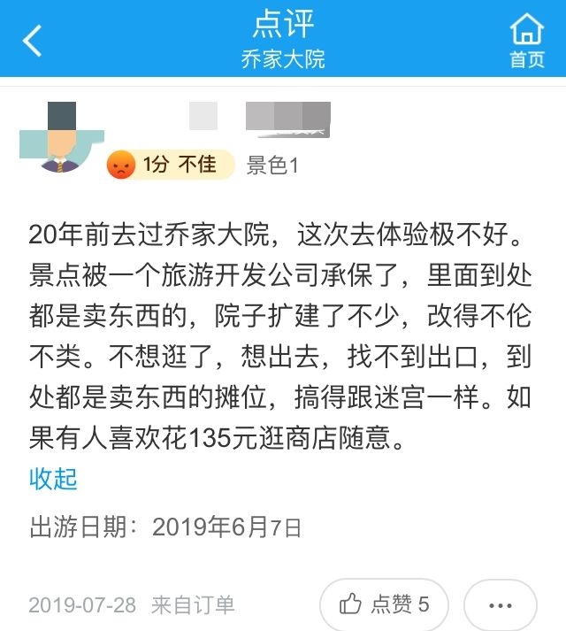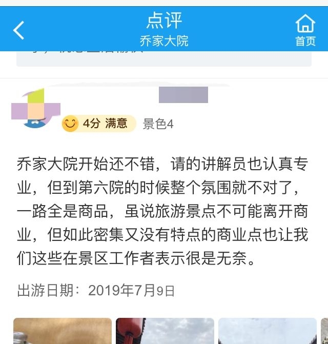 文旅部向乔家大院下发摘牌通知前,在线旅游平台上的游客评价