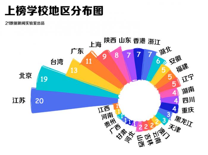 从上榜学校地区分布来看,江苏有20所高校上榜,位列地区第一,其次是北京(19所)和台湾(13所)。