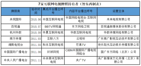 7家互联玩电视牌照持有者2010年3月,国家广电总局给CNTV颁发了首张互联电视牌照,牌照持有方负责建设互联网电视集成平台。此后,上海百视通、浙江华数、南方传媒、中国国际广播电台、中央人民广播电台、湖南电视台共6家单位先后获颁互联网电视集成牌照,这7家平台也成为了后来互联网电视内容的集成提供方。