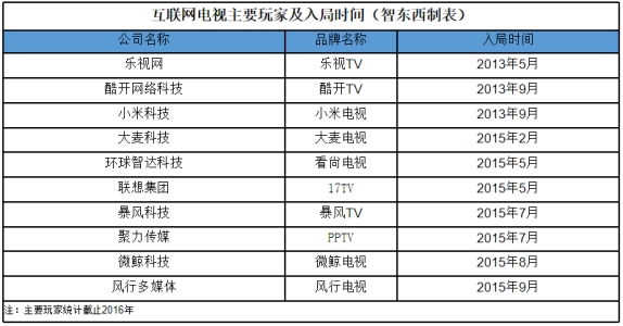 互联网电视主要玩家统计短时间内,暴风、微鲸、PPTV等相继入局,原本只有个位数玩家的互联网电视领域成了几十个玩家的大混战。这里有一个玩家不得不提,那就是微鲸。微鲸由黎瑞刚、李怀宇等人于2015年创立,成立伊始,微鲸就定位做互联网电视,并获得了华人文化、阿里、腾讯的20亿元启动资金,阵容堪称豪华。