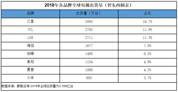 根据群智咨询调查数据,2018年全球电视出货量为2.398亿台,中国第一、全球第二的TCL 2018年全球出货量为2785万台,即使小米2019年全年的互联网电视销量突破1000万台,也才刚刚超出TCL 2018年出货量的三分之一。