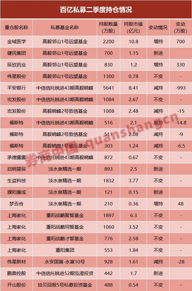 具体来看,高毅资产冯柳二季度新进健民集团,并加仓金域医学、辰欣药业,目前的持股市值已达14亿元;高毅首席投资官邓晓峰则减持了平安银行,小幅减持福斯特、宏发股份,目前持股市值达19亿。赵军的淡水泉也保持积极态势,新进了启明星辰、濮阳惠成,小幅增持梦百合。