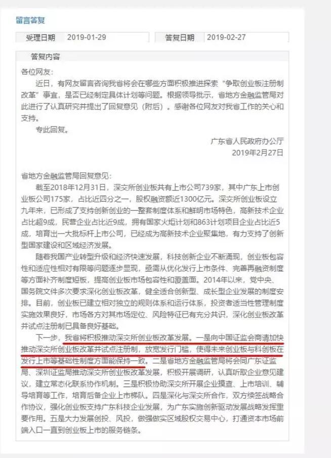 2月27日,广东省地方金融监管局回复意见明确指出,下一步,广东省将积极推动深交所创业板改革发展。其中提到两点与注册制以及创业板改革有重要的联系,即: