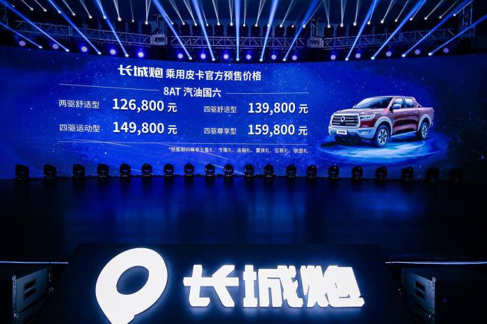 在发布会上,长城炮新品牌推出两种版本共4款乘用皮卡车型,预售价区间为12.68万-15.98万。