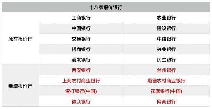 8月17日,央行正式宣布改革完善贷款市场报价利率(LPR)形成机制。其中改革措施包括扩大报价行范围,在原有的10家全国性银行基础上增加城市商业银行、农村商业银行、外资银行和民营银行各2家,扩大到18家。