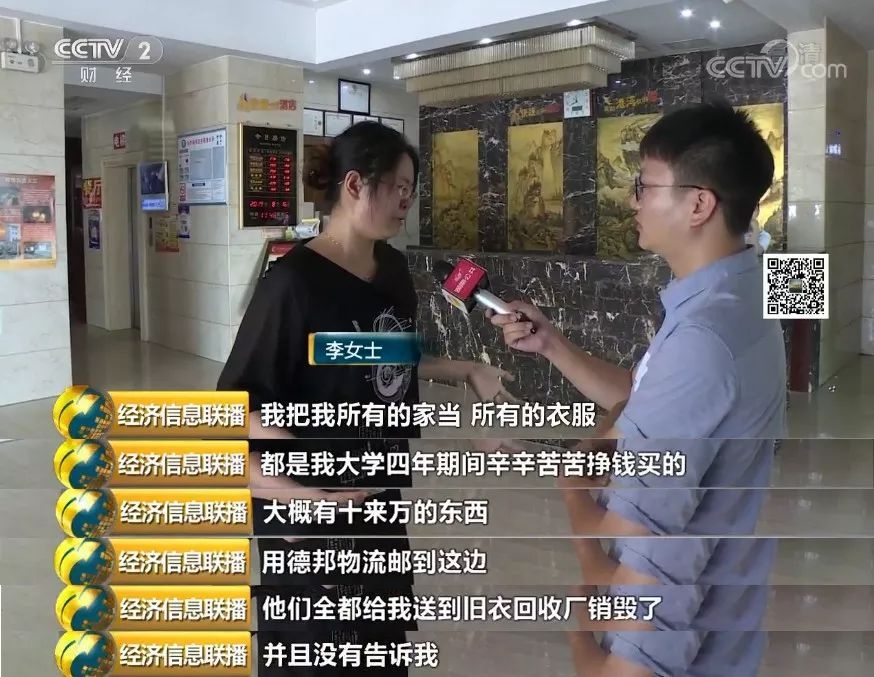 李女士:我把我所有的家当、衣服,通过德邦物流邮到这边,他们全部都给送到旧衣服回收厂销毁了,并且没有告诉我。这些都是我大学四年期间辛辛苦苦挣钱买的,价值十几万元。