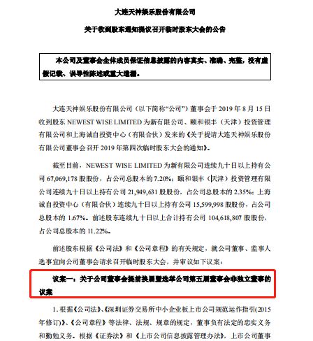 8月15日晚间,天神娱乐收到占公司总股本11.22%的为新公司、颐和银丰(天津)投资管理有限公司(简称“颐和银丰”)和上海诚自投资中心(有限合伙)(简称“上海诚自”)等三名股东发来的通知,要求董事会召开临时股东大会,并更换现有所有董事和监事。