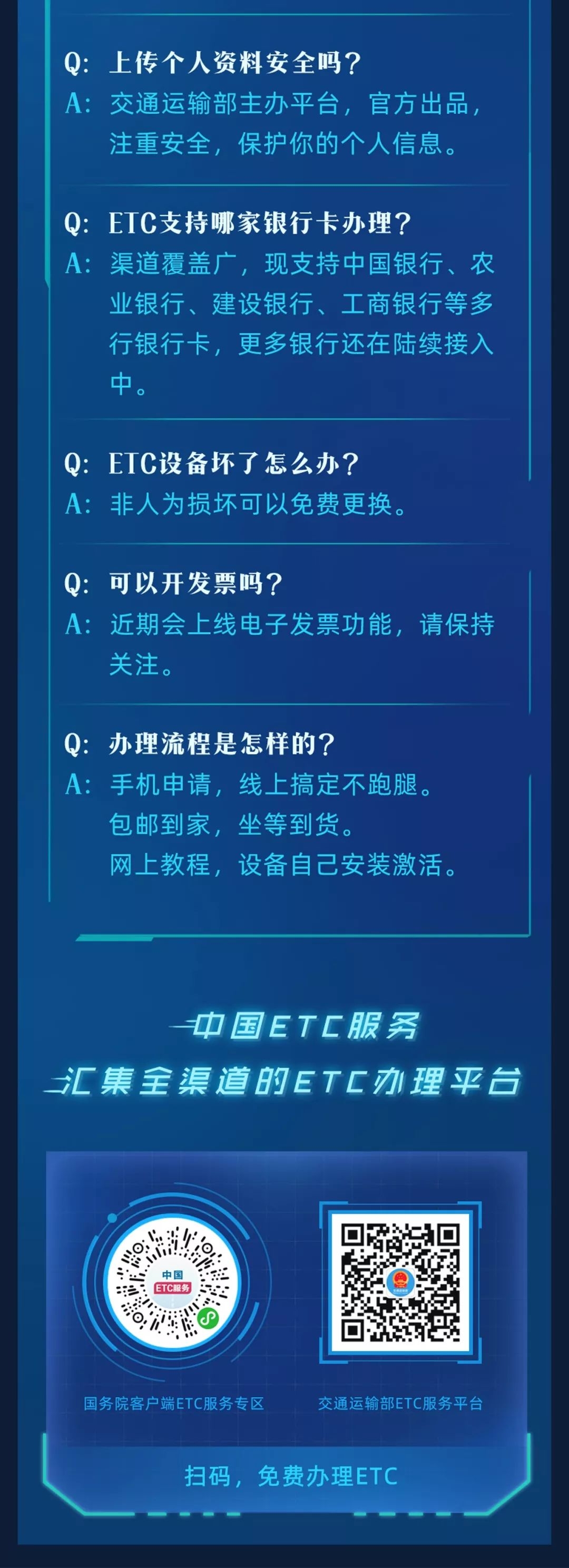 对于注册流程,交通运输部介绍中表示,进入平台的ETC注册后,上传申请人身份证、行驶证、车辆信息等,再与银行卡绑定即可以完成注册。