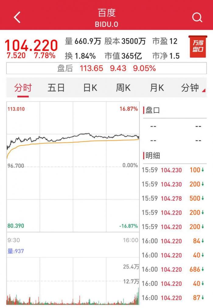 百度当日收盘报104.22美元,上涨7.78%。受财报提振,百度盘后大涨10%。截至北京时间7:14分,百度盘后涨9.05%。