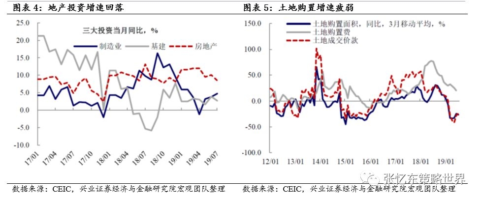 2019年上半年一枝独秀的地产投资增速开始回落。地产投资单月同比从6月10.5%降至7月8.5%,制造业投资依然谨慎,基建投资增速下行。