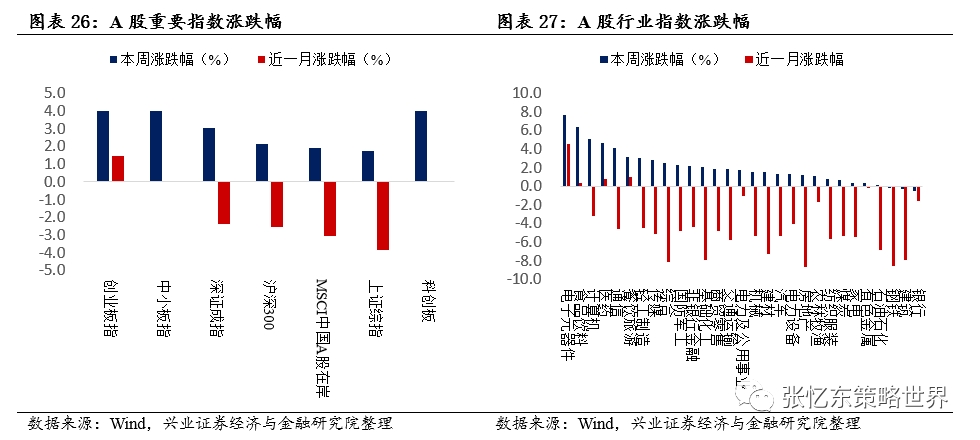 本周,A股市场表现较好,主要指数全线上涨,其中创业板指与科创板表现最佳,涨幅4.0%,沪深300和上证综指涨幅为2.12%和1.77%。行业上,除银行、建筑和钢铁行业外,其余行业均上涨。电子元器件与食品饮料涨幅较大,分别为7.67%与6.38%。近一月以来,电子元器件涨幅居首,为5.76%。