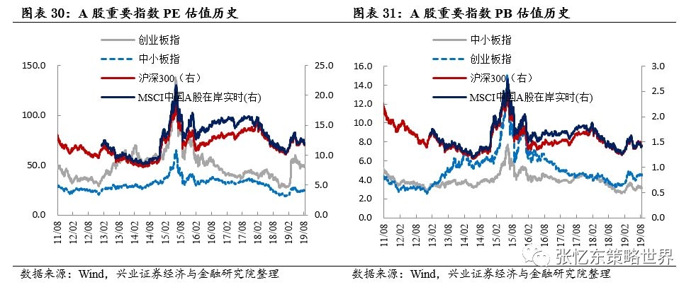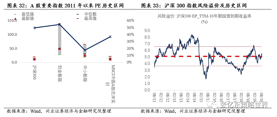 当前沪深300、创业板、中小板和MSCI中国A股在岸指数的PE(TTM)分别为11.8、49.8、24.8和11.9倍,分别处于2011年以来的50%、54%、17%、37%分位数水平,较上周有所修复;以沪深300指数PE倒数与10年期国债收益率之差衡量的风险溢价与上周持平,高于2011年以来的平均值。