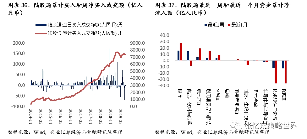 自6月初,陆股通净流入有所恢复,但该趋势在7月呈现停滞;本周陆股通有所好转,扭转净流出态势,净流入9亿人民币。本周陆股通主要流入银行和食品饮料,持续流出技术硬件与设备和保险。