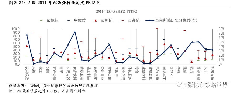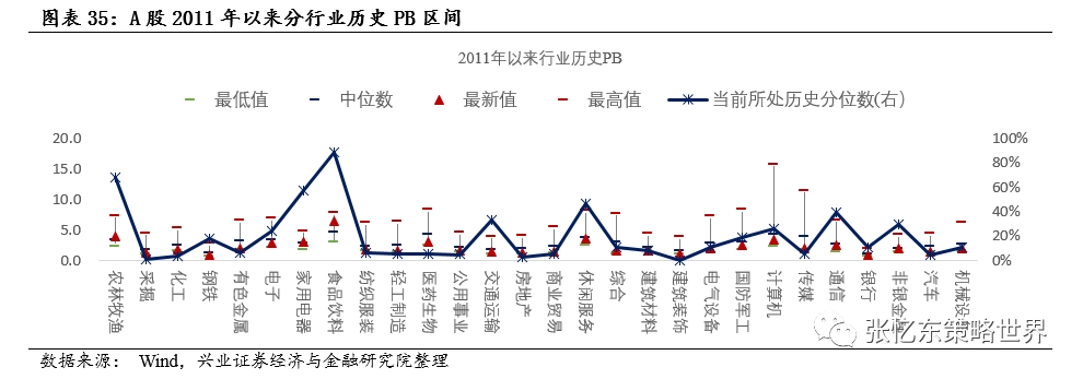 分行业来看,食品饮料、农林牧渔、非银金融和银行当前PE处于2011年以来的分位数中间偏高水平,分别是74%、66%、51%和49%;采掘、建筑材料、钢铁、商业、地产、化工、轻工、纺织服装、电子PE、PB都处于2011年来分位数较低水平。