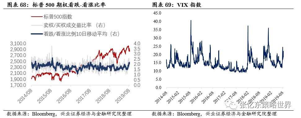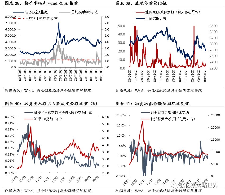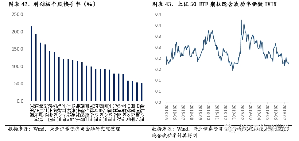 本周A股日均换手率为0.89 %,低于上周的0.98%,低于2011年以来的平均水平;涨停家数/跌停家数比(10日移动平均)为2.94,高于上周的2.69;融资买入额占全部A股成交金额比重为0.078%,较上周的0.073%有所下降,处于2014年以来的低位水平;融资融券余额8,945亿元人民币,比上周略有上升。科创板本周的换手率有所下降但仍居高位,沃尔德周换手率高达215.8%,最低的澜起科技周换手率51.6%。上证50ETF期权隐含波动率指数IVIX最新值为18.0%与上周持平,处以2018年年初以来的低位水平,显示出投资者预期市场未来波动较低。