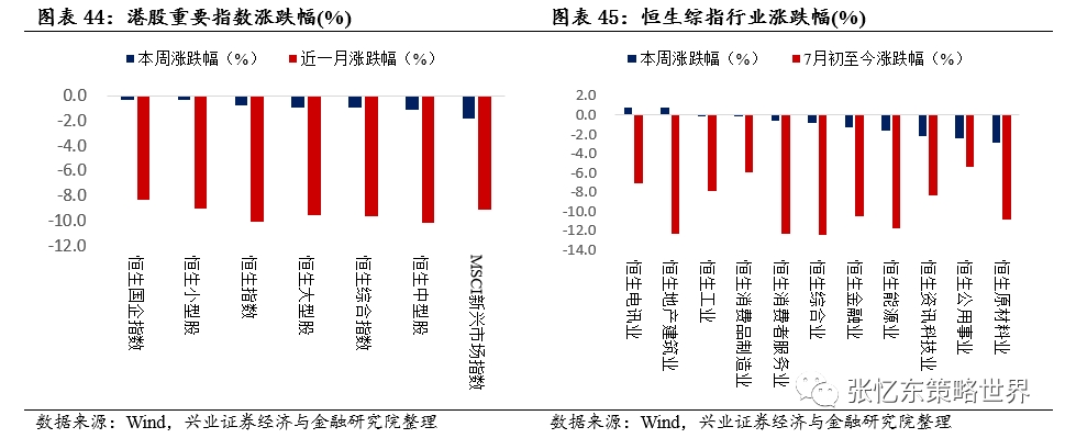 本周,港股主要指数普遍小幅下跌。恒生指数、恒生国企指数分别收跌0.8%和0.3%。分行业来看,除恒生电讯业和地产建筑业,其余行业指数全部下跌,恒生电讯业和地产建筑业涨幅分别为0.8%和0.7%;跌幅较大的为恒生原材料业,跌幅为2.9%。