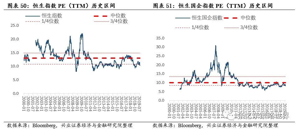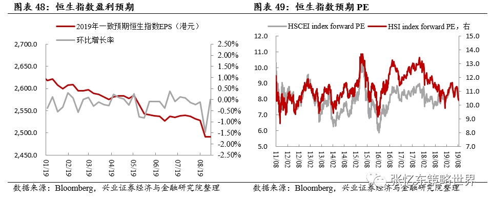相较于上周的10.4倍和8.08倍,恒生指数和国企指数预期市盈率(PE)本周分别下降为10.3和8.06倍,恒指预期PE已经接近2011年以来的1/4位数10.22倍,国指预期PE亦低于2011年以来的中位数8.11倍。恒生指数一致预期EPS自8月以来下滑明显,本周水平与上周几乎持平。