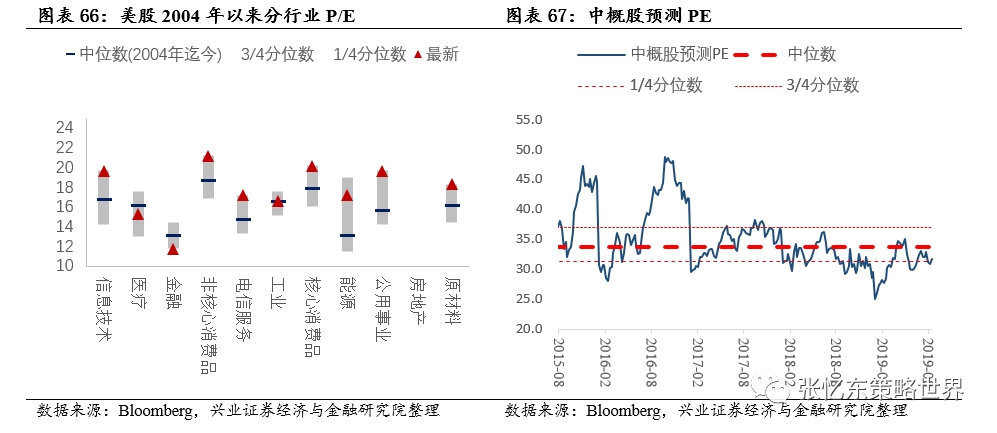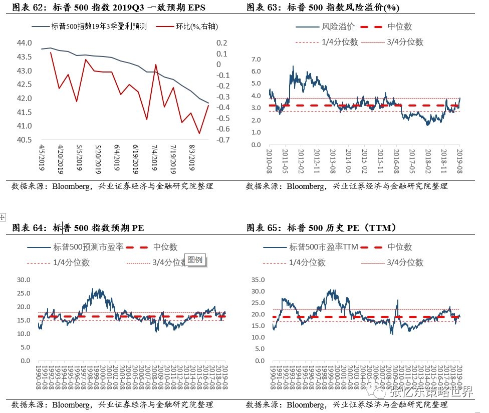 自今年5月以来,标普500指数19年3季度盈利预测不断下滑,本周较上周下跌38.1%。美股估值有所回落,但是,依然不算便宜。当前标普500预测市盈率为17.5,比上周的17.65倍下降0.15,接近1990年以来3/4分位数;市盈率(TTM)为18.9,低于上周的19.1,但仍高于1990年以来的中位数。从行业估值上,当前美股除了金融行业外其他行业均接近或高于3/4分位数,医疗行业和工业估值接近中位数水平。